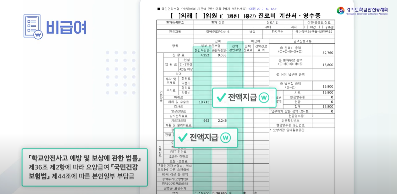 진료비 계산서 내역에서 건강보험이 적용된 급여 항목은 보험금 지급이 전액 가능합니다. 그러나 원칙적으로 비급여 부분은 보상이 되지 않습니다. 그러나 일부 요양급여 지급 기준에 해당하는 항목은 세부 내역서를 통해 심사 후 보상이 가능하니 참고해 주세요.