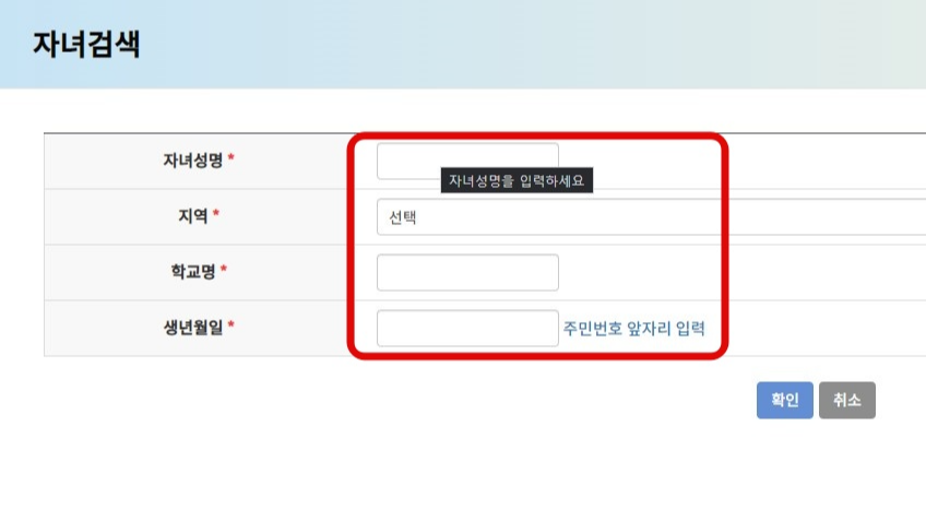 4. 자녀 검색에서 자녀성명, 지역, 학교명, 자녀 생년월일을 기입합니다.