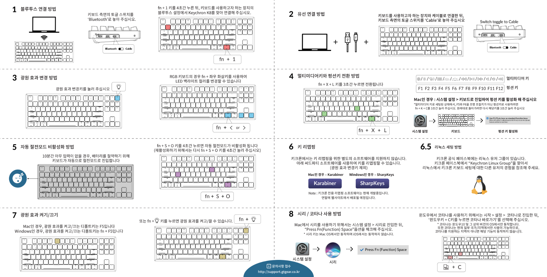 키크론 키보드 퀵스타트 가이드 입니다. 이미지를 클릭하면 큰이미지로 볼수 있습니다. 블루투스 연결 방법, 광원 효과 변경 방법등 기본적인 사용 방법에 대해 나와있으니 참고하세요.