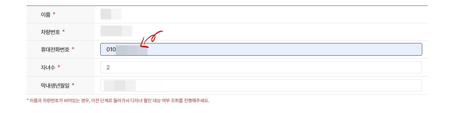 5) 대상 가능이면 다음 화면에서 이름, 차량번호, 자녀수, 막내 생년월일이 자동으로 기입됩니다. 본인의 휴대전화 번호만 입력합니다.