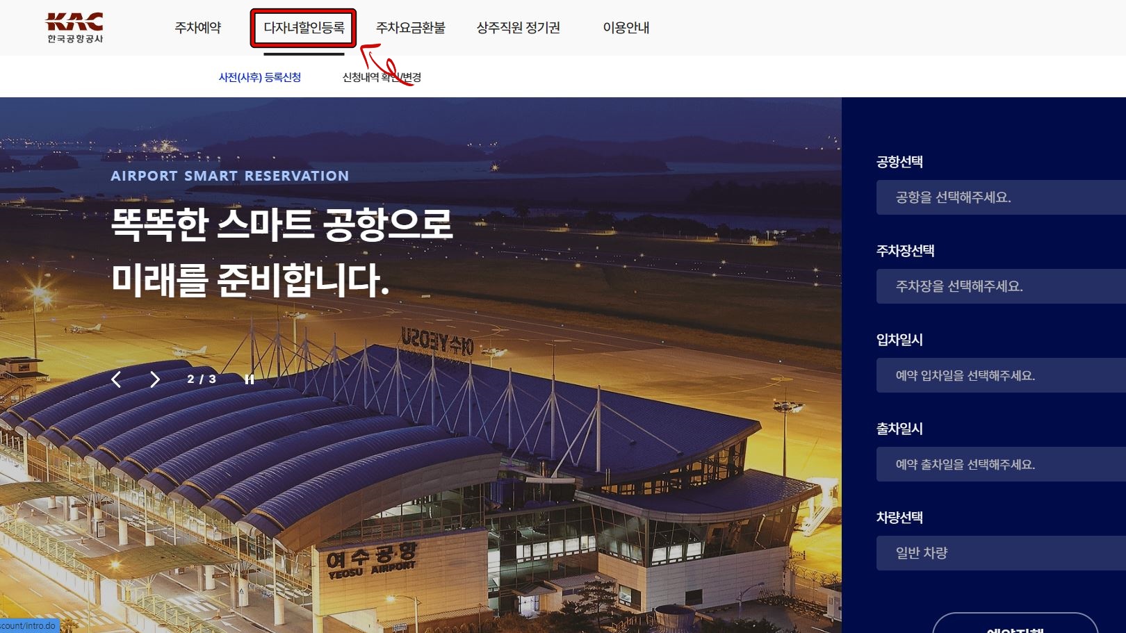 1) 전국공항 주차홈페이지 사이트에 접속합니다. 2) 페이지 상단 메뉴에서 ‘다자녀할인등록’ 메뉴를 선택합니다.