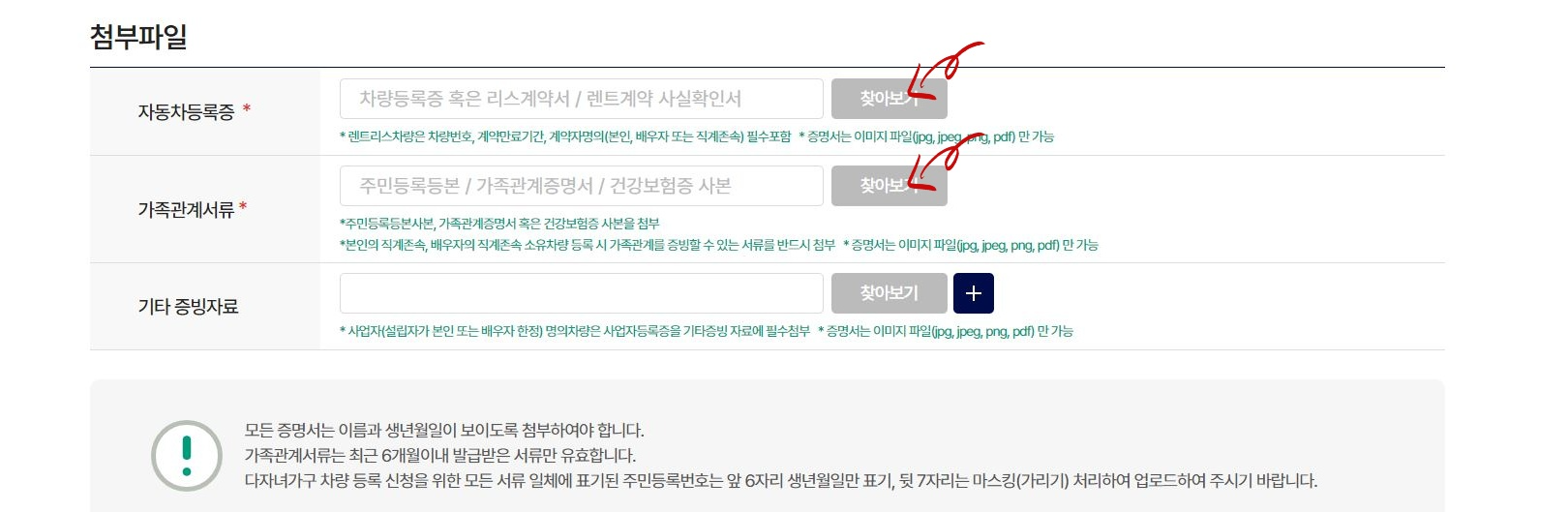 6) 첨부파일에 자동차등록증과 가족관계서류를 첨부하고 [신청하기] 버튼을 클릭합니다. 첨부파일은 jpg, jpeg,png,pdf 파일만 가능합니다.