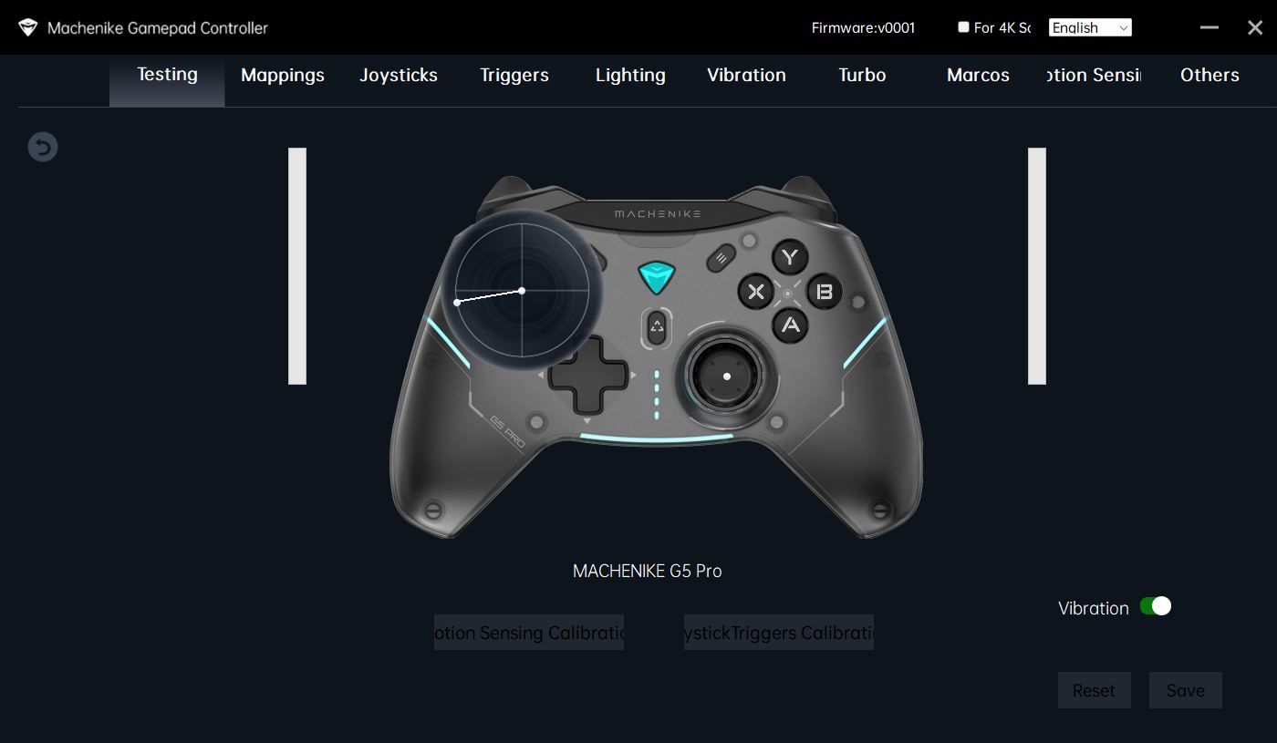 전용 프로그램을 통해 버튼/진동 테스트, 버튼 맵핑, 조이스틱/트리거, RGB, 진동, 터보기능, 매크로, 캘리 등 다양한 설정을 할 수 있습니다.