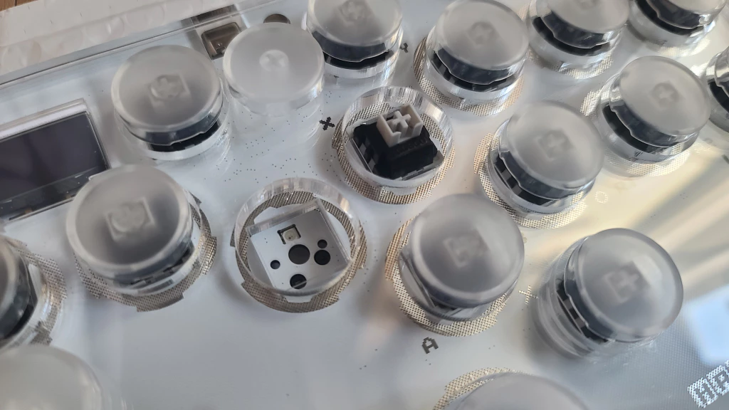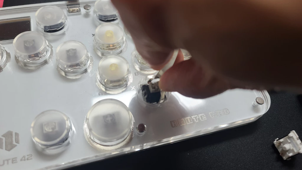 이 패드를 구입하게 된 결정적인 이유 중 하나인데, 전 키 핫스왑 지원으로 원하는 스위치로 손쉽게 변경할 수 있고 스킨 제작도 손쉽다는 점입니다. 5핀, 3핀 스위치 대부분 호환됩니다. 동봉된 스위치 리무버를 이용해서 스위치를 빼주고 원하는 스위치로 교환합니다.