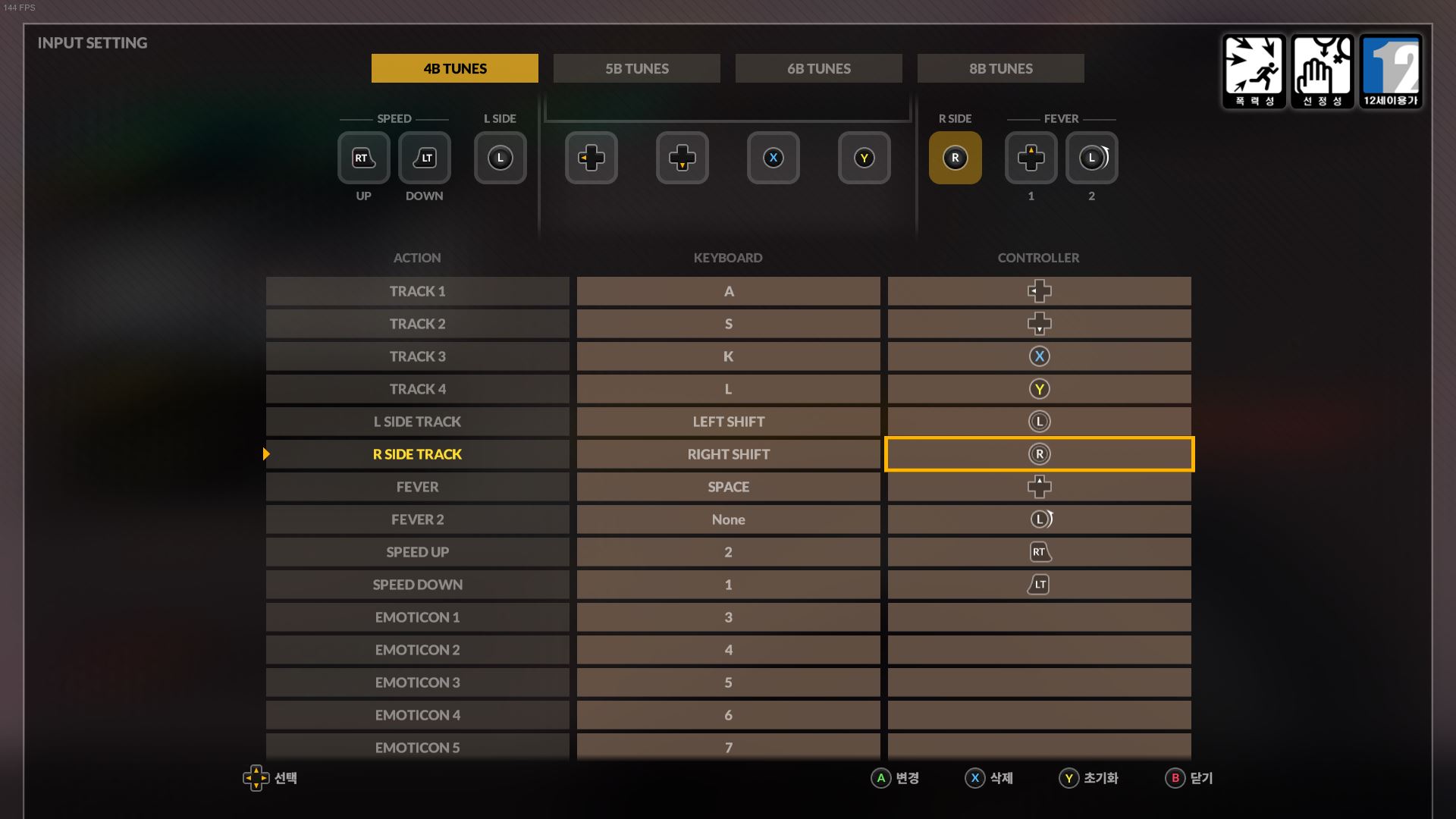 기본 설정입니다. 컨트롤러 설정은 패드 기준으로 되어 있어 좌, 위, B, Y 버튼으로 기본 설정되어 있네요.
