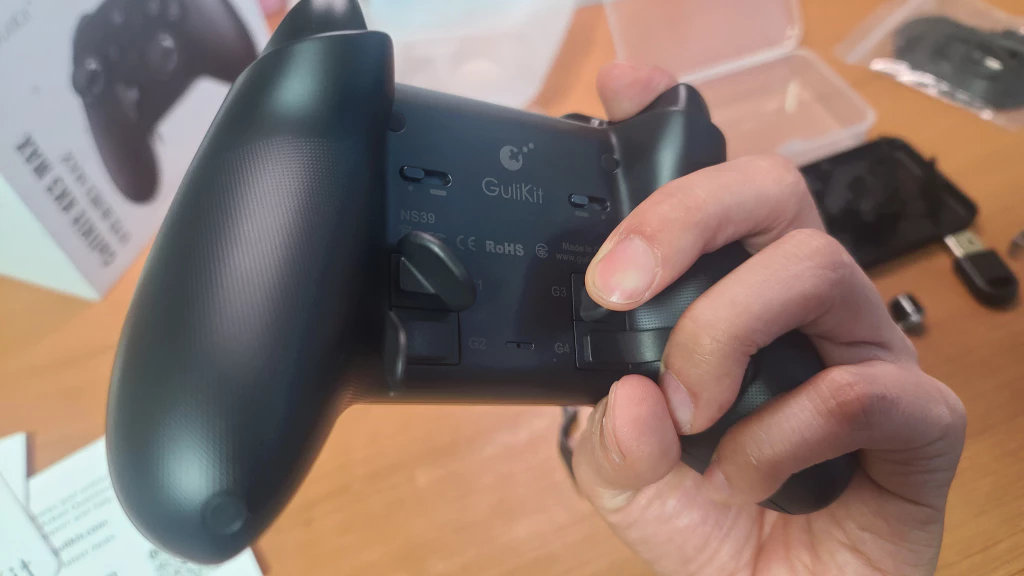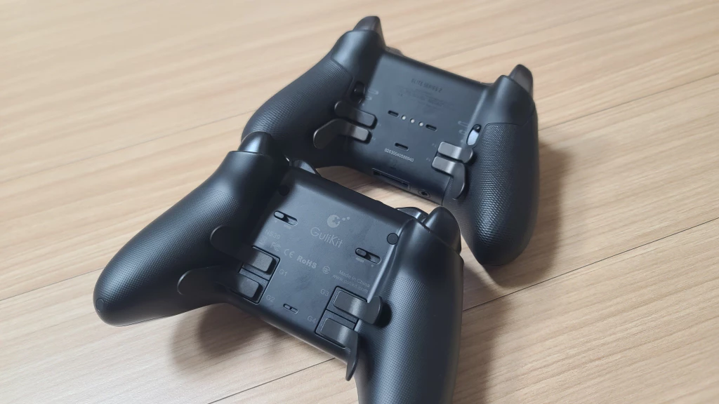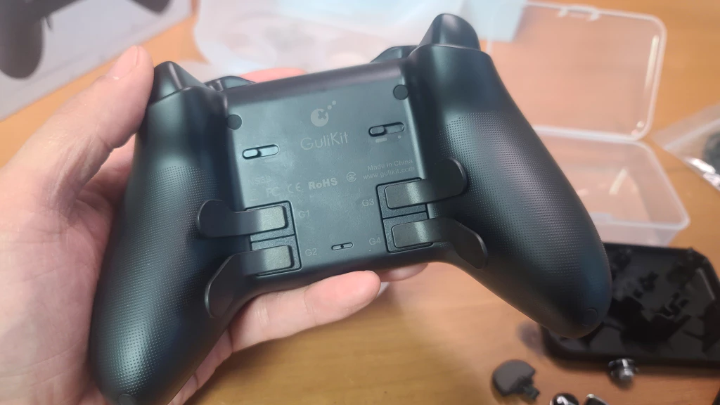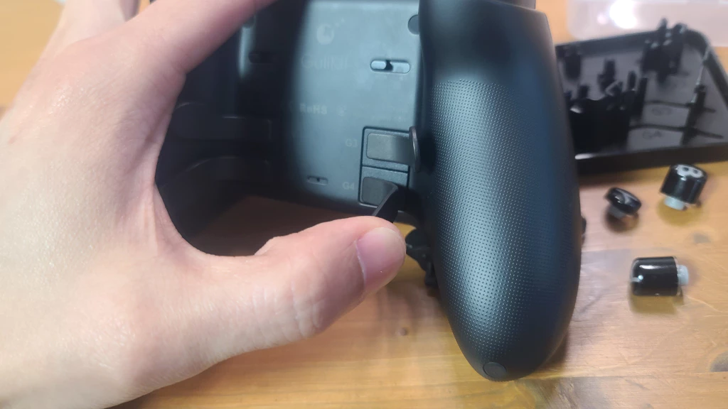 LR 버튼은 엑박 패드가 딱딱 눌리는 느낌이라면 굴리킷 KK3는 실리콘 버튼 눌리는 느낌으로 좀 더 정숙하고 말랑합니다. 트리거 버튼은 후면의 스위치를 토글 하여 2가지 방식으로 조절할 수 있게 되어 있습니다. 첨에는 엘리트 패드처럼 버튼의 깊이만 조절되는 건 줄 알았는데 트리거 버튼으로 택타일 스위치 트리거 모드와, 홀 효과 아날로그 트리거 모드로 전환됩니다.