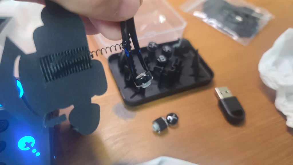 보관 케이스 안쪽에는 무선 1000Hz 폴링레이트를 지원하는 하이퍼링크 어댑터와 버튼 제거용 집게가 들어있네요.