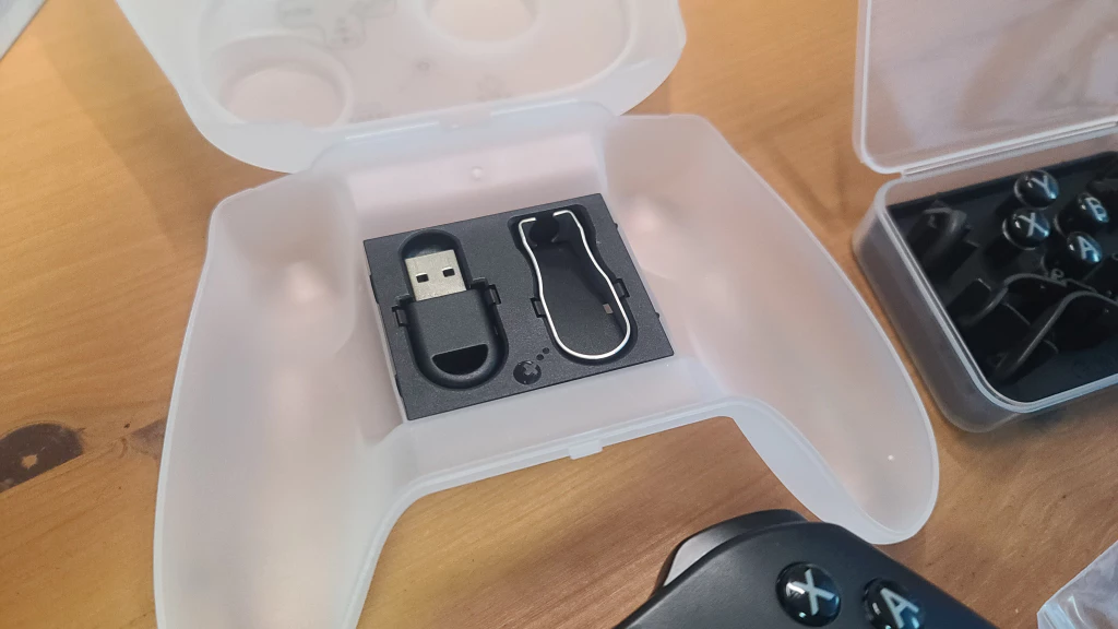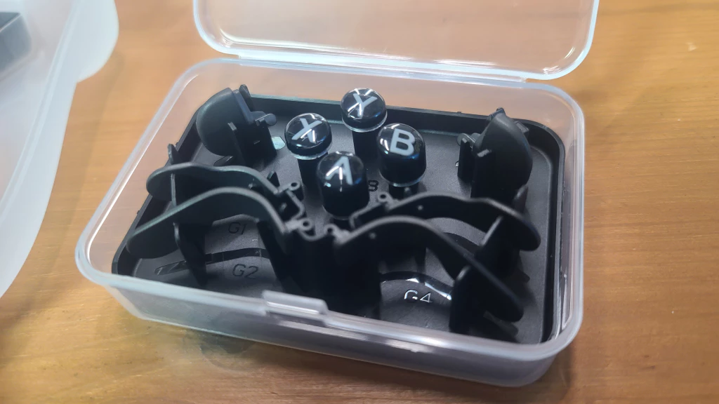 메탈 재질의 패들 버튼과 2개의 하프 돔 버튼, 그리고 교체용 엑스박스 배열의 A/B/X/Y 버튼이 케이스 안에 들어있습니다.