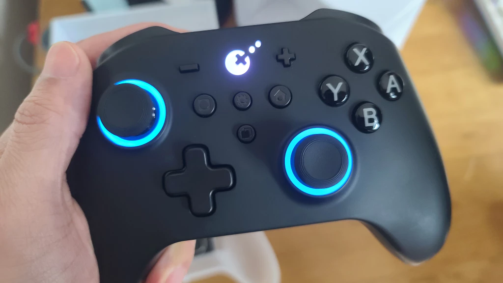 컨트롤러의 디자인은 더욱 화려하게 만들어 줍니다. 중앙 로고와 스틱 주변에는 RGB LED가 통합되어 있어 사용자는 LED의 밝기를 조절하거나 완전히 끌 수 있습니다. 이는 게임 플레이 경험을 더욱 즐겁게 만들어줍니다. 아쉬운점은 RGB 색상 변경이 안된다는 점입니다.