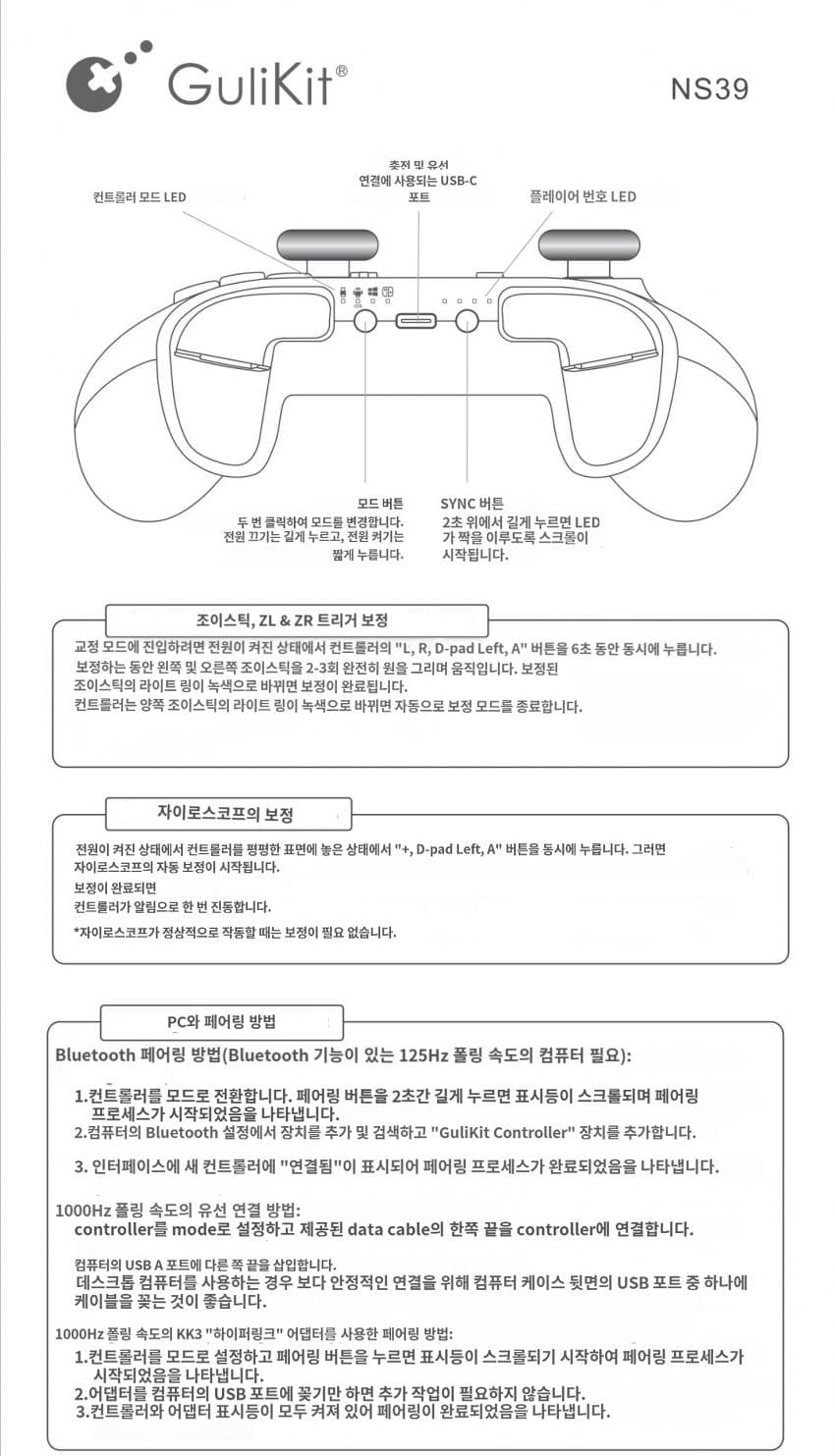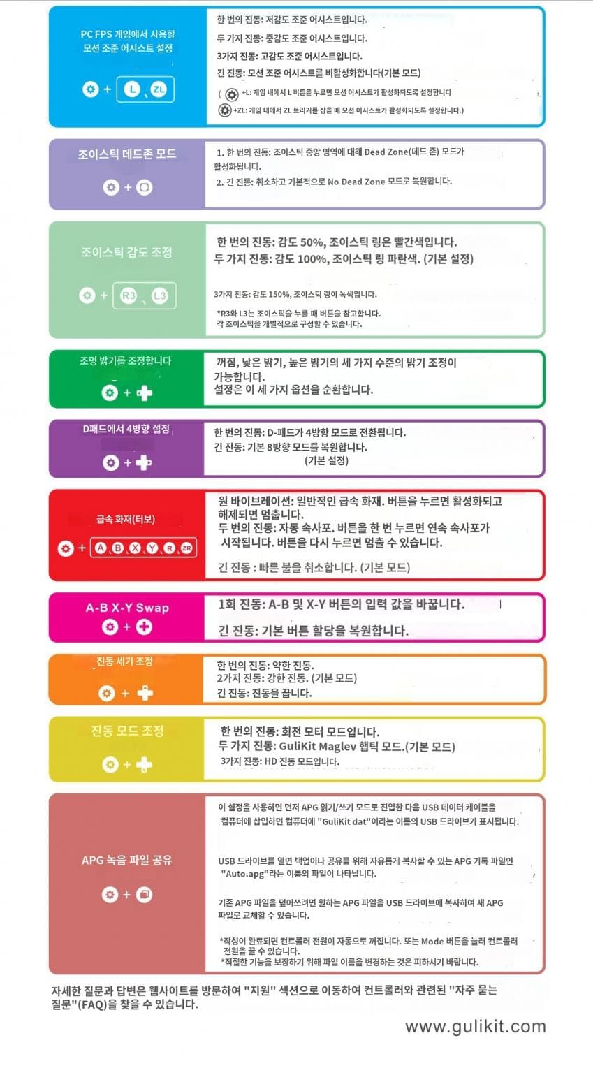 처음에 불량 받았다 생각해서 판매자에게 문의하니 굴리킷 기술자에게 제품 문제를 설명하고 알아보겠다 하면서 펌웨어 업데이트를 해보라고 알려주네요. 펌웨어 업데이트를 하려다 설명서를 다시 찬찬히 보다 보니 조이스틱, ZL / ZR 트리거 보정이란 문구가 보이길래 캘리브레이션을 해줬더니 문제가 싹 해결되었네요.