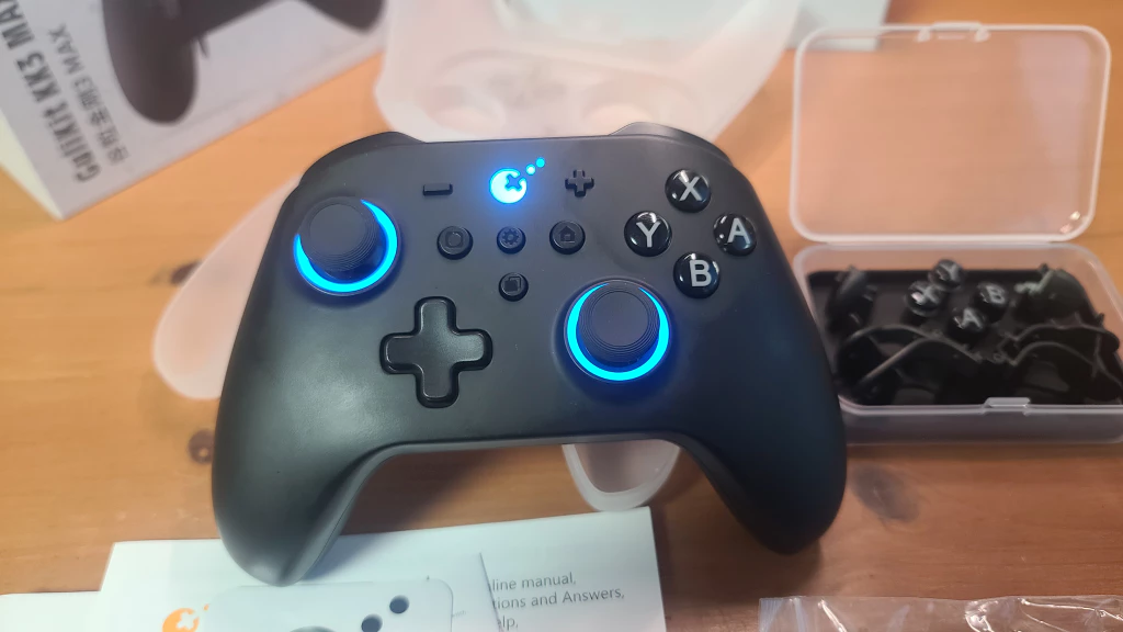 뭐든 기본 구성이 알차게 들어있으면 기분 좋습니다. 이 굴리킷 KK3 MAX 제품의 기본 구성도 참 알찬 구성으로 되어있네요. 언박싱하면 플라스틱 케이스 안에 컨트롤러, 백 패들과 A/B/X/Y 버튼 세트, 충전 케이블 및 사용 설명서, 스티커가 정성스럽게 포장된 세트로 사용자를 맞이합니다.