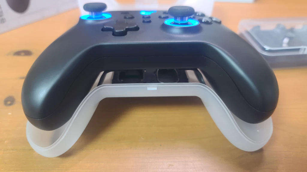 전체적인 디자인은 엑스박스 4세대 많이 비슷합니다. 다만 버튼 배열은 스위치 형식으로 되어 있습니다. 사실 디자인 하나 보고 구입한 제품입니다. 엘리트패드나 듀얼센스 빼고 서드파티 제품중에 구입했던 컨트롤러들의 가격대는 3-5만 원대 제품들이었는데 이 제품은 7만 원대의 나름 고가의 제품입니다. 이미지에서 보이던 엄청나게 고급스러움이 느껴지진 않지만, 첫인상은 상당이 이쁘다였습니다. 엑박 패드에 익숙한 저에게 손에 딱 잡히는 모양도 만족스럽고 LED 색상도 이쁘니까 첫인상은 합격점! 개인적으로 이렇게 아날로그 스틱 주변에 LED가 들어오는 패드를 선호합니다.