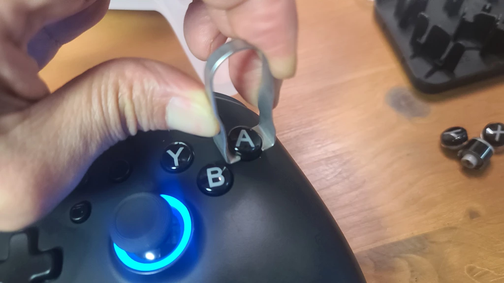키캡 리무버를 이용해서 키캡을 제거하는 모습입니다. 모든 키캡을 빼주고 A/B/X/Y 엑박 배열 키캡을 장착해 주면 됩니다.