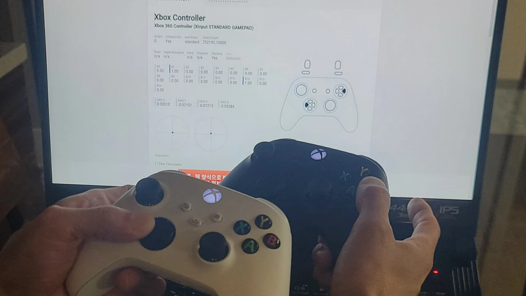어댑터를 PC에 연결한 후, 엑스박스 컨트롤러 전원을 켜고 페어링 버튼을 길게 눌러 페어링 모드로 진입합니다. 이때 엑스박스의 로고 버튼의 불빛이 빠르게 깜박입니다. 무선 어댑터의 연결 버튼을 눌러 컨트롤러와 페어링 합니다. 이제 컨트롤러가 PC에 성공적으로 연결되었는지 확인할 수 있습니다. 연결되면 어댑터와 컨트롤러의 LED가 모두 켜져 있습니다.