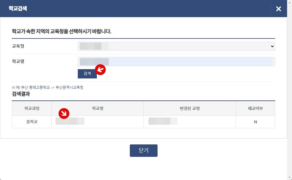 6. 신청 정보를 입력합니다. 학교검색을 클릭하여 자녀의 학교가 속한 지역의 교육청을 선택하고 학교명을 입력하고 검색 버튼을 누릅니다. 검색 결과에 나타나는 학교명을 클릭합니다. 다음으로 신청용도를 작성하고(예: 회사제출용) 수령방법을 선택합니다.
