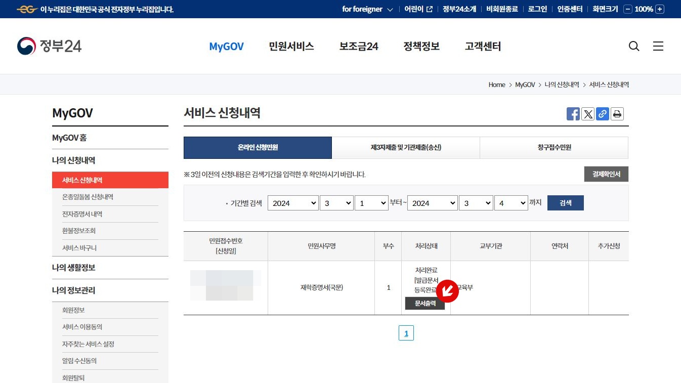 7. 민원 신청내역에서 문서출력을 선택합니다.