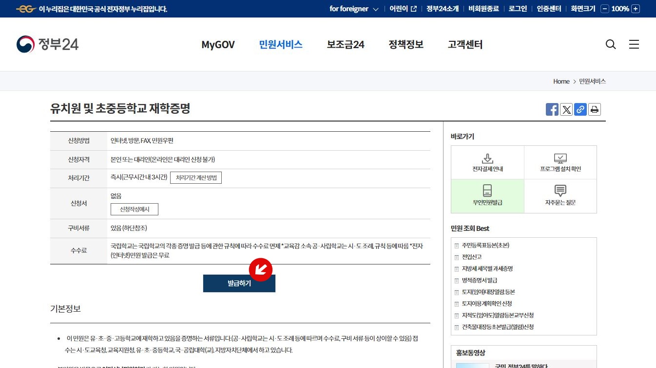 5. 민원 서비스 화면에서 유치원 및 초중등학교 재학증명 발급하기 버튼을 클릭합니다.