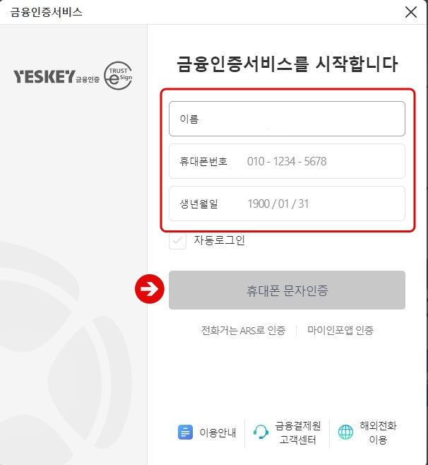 3. 금융 인증서 로그인을 위해 인증서를 불러옵니다. 금융인증서 > 인증요청하기> 금융인증서비스