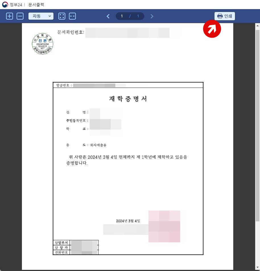 8. 미리보기 화면에서 인쇄 버튼을 눌러 문서를 출력합니다.