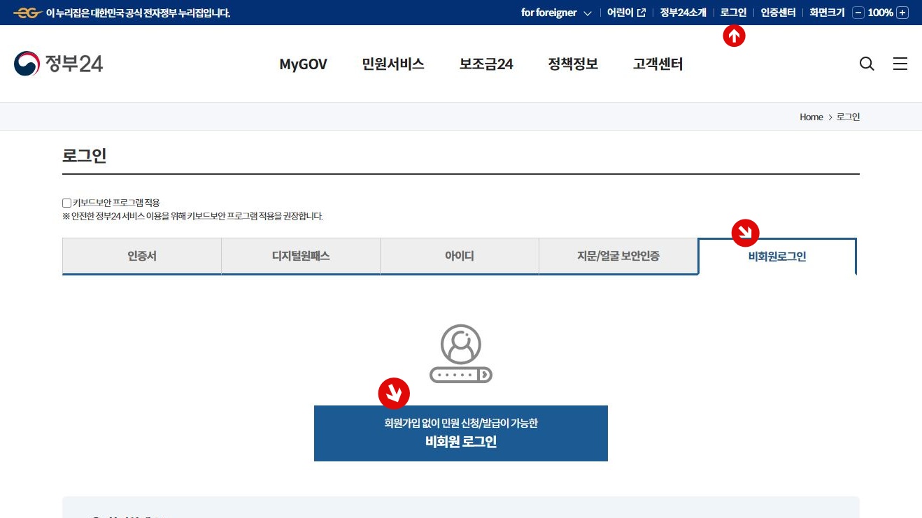 1. 먼저, 정부 24 홈페이지에 접속합니다. 회원가입이 되어 있다면 로그인하면 되지만, 보통 자녀가 정부24에 가입되어있지는 않을 텐데요. 이럴 때는 따로 회원 가입하지 마시고 비회원 로그인을 이용하세요.