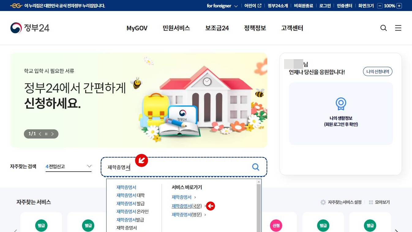 4. 비회원 로그인 후 정부 24 홈페이지 메인화면에서 검색란에 [재학증명서]라고 입력하면 서비스 바로가기 재학증명서(국문)를 선택하세요.