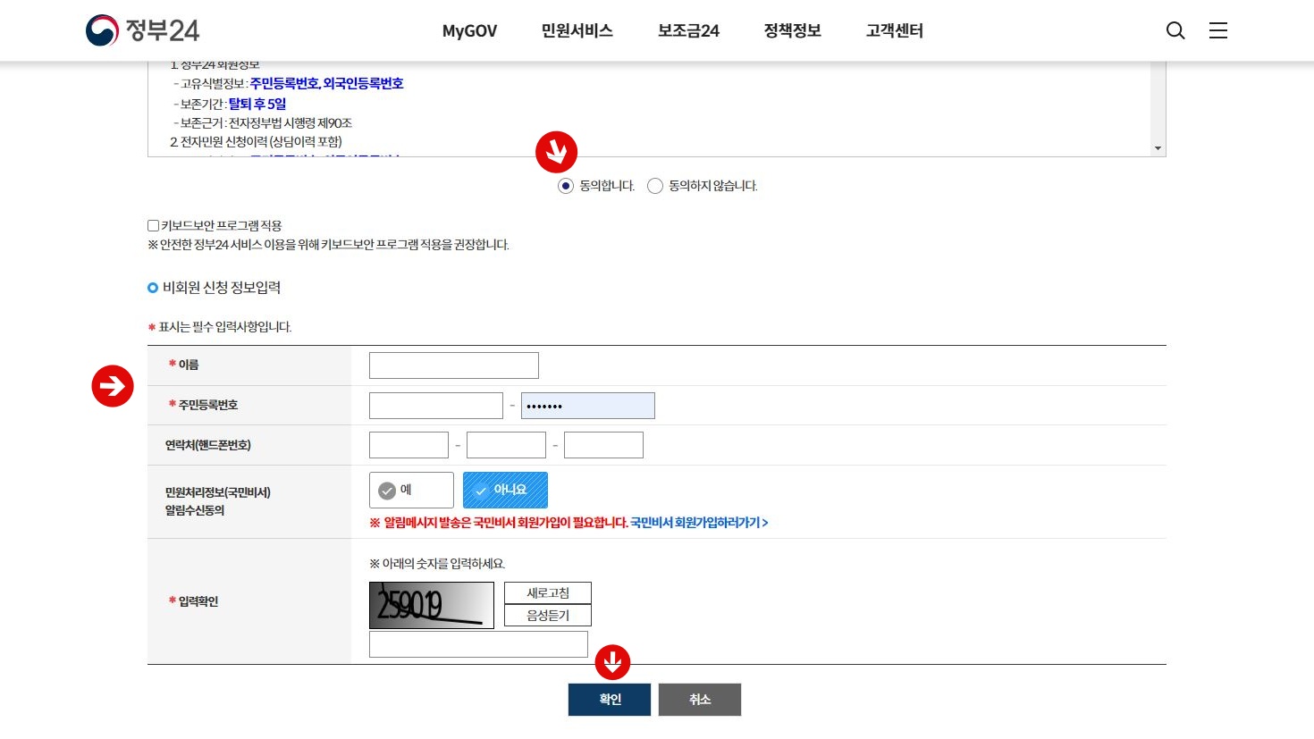 2. 개인정보 수집 및 고유식별정보 수집 이용동의 모두 [동의합니다] 체크하고 비회원 신청 정보입력사항에 [이름], [주민등록번호], [입력확인]에 모두 입력합니다. *표시 필수 입력