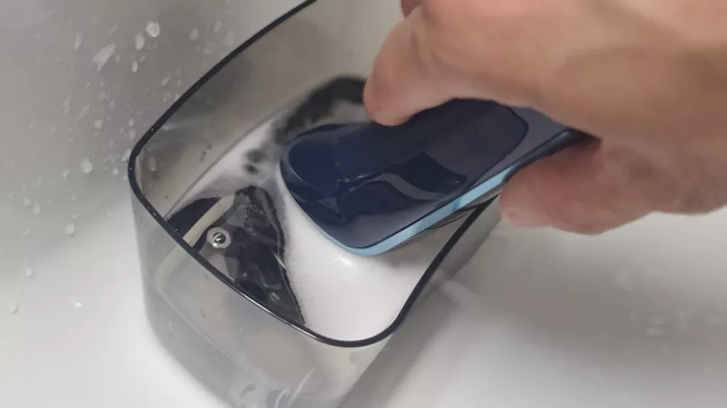 세척할 그릇에 따뜻한 물을 담고, 클렌저를 살짝 풀어줍니다. 집에 있는 액체 비누나 바디워시를 쓰면 충분히 세척 효과를 높일 수 있어요. 면도 헤드가 결합된 상태로 전원을 켜고 물에 담가둡니다. 한 1분 정도만 켜놓고 두면 거품이 나면서 세정액이 날 안쪽까지 돌아가면서 속속들이 세척해 줘요. 이게 바로 면도기 세척기의 원리랑 똑같답니다!