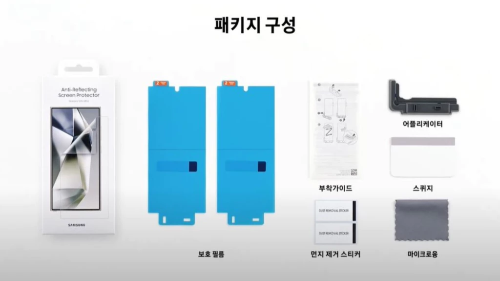 이 제품은 구성품부터 확실히 차별화됩니다. 필름 2장이 기본으로 들어있고, 스퀴지, 먼지 제거 스티커, 마이크로융, 어플리케이터와 부착 가이드까지 완벽하게 포함되어 있어요. 사실 필름 하나 붙이려고 이런 구성까지 필요한가 싶었지만, 실제로 사용해 보니 너무 편리했습니다.