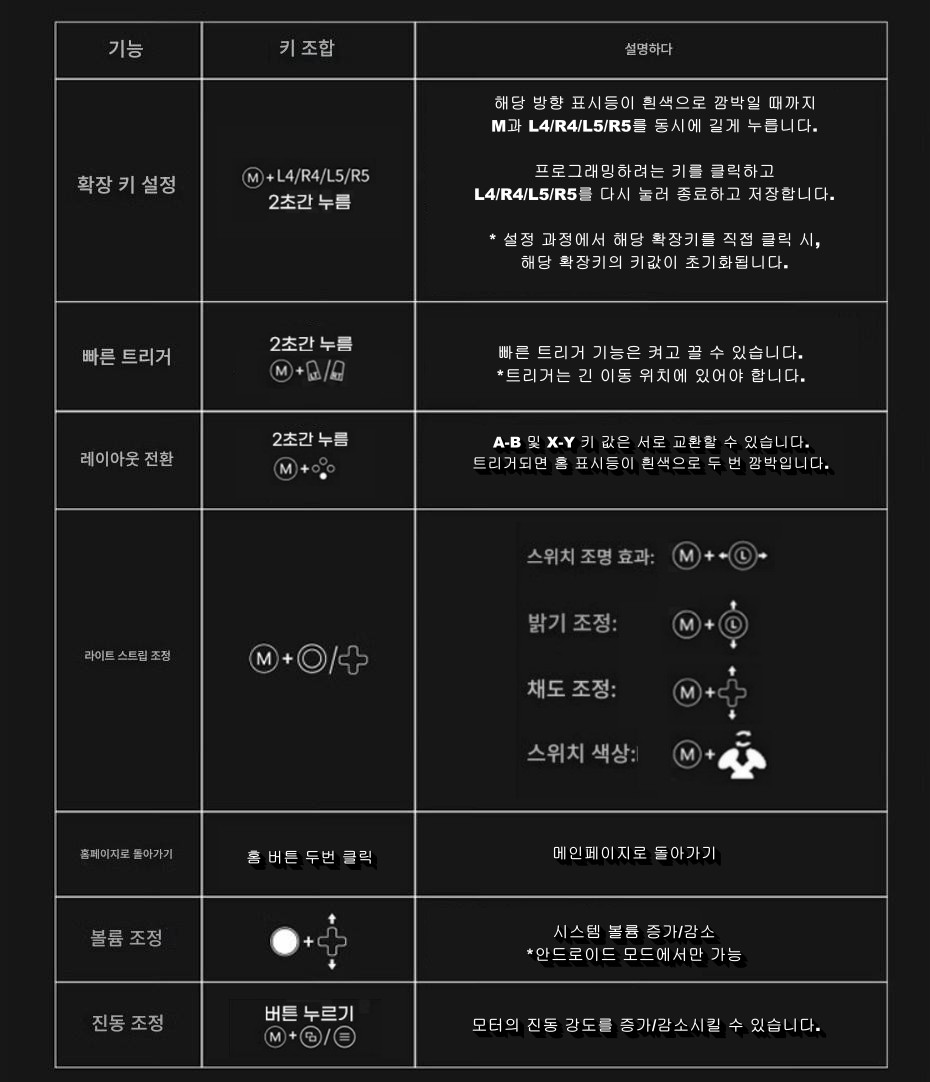 | 레이아웃 전환 | M + A (2초간 누르기) | - A↔B, X↔Y 버튼의 위치 값을 서로 바꿉니다 (Xbox ↔ Switch 배열 전환). - 전환 시 홈 버튼 표시등이 흰색으로 두 번 깜빡입니다. |