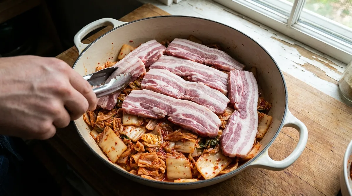 이제 냄비 바닥에 먼저 손질한 묵은지를 골고루 깔아줍니다. 그 위에 돼지고기를 듬뿍 올려주세요. 재료를 볶지 않고 바로 쌓아서 끓이는 '원팟' 방식이라 설거지도 줄어들고 만들기도 정말 편합니다.