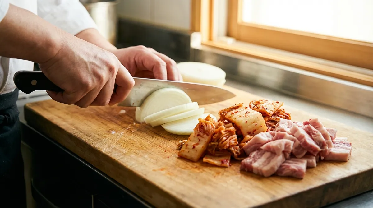 양파 400g은 1cm 폭으로 너무 가늘지 않게 채 썰어주시고, 대파는 어슷썰기로 준비합니다. 묵은지와 돼지고기는 숟가락으로 듬뿍 떠먹기 좋게 한 입 크기로 썰어두세요. 고기는 기름기가 적당히 있는 삼겹살을 사용해야 국물에 풍미가 확 살아나더라고요.