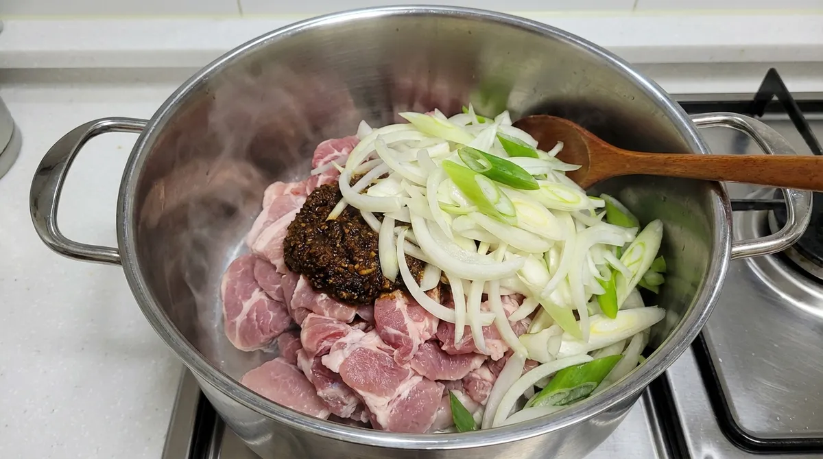 미리 섞어둔 짜글이 양념장을 고기 위에 턱 하니 얹어주세요. 앞서 말씀드렸듯 3인분 조리 시에는 만든 양념장의 1/3인 약 145g 정도만 사용하시는 게 간이 딱 맞습니다. 그 위에 채 썬 양파와 대파를 수북하게 올려 마무리합니다.