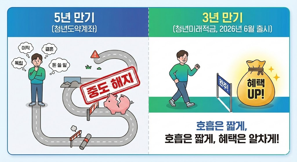 사실은 이렇습니다. 정부도 이 문제를 인지했는지, 2026년 6월에 출시될 청년미래적금은 만기를 3년으로 확 줄였어요. 호흡은 짧아졌는데 혜택은 더 알차게 채웠으니, 이젠 중도 해지 걱정 없이 '완주'를 꿈꿔볼 수 있게 된 거죠.