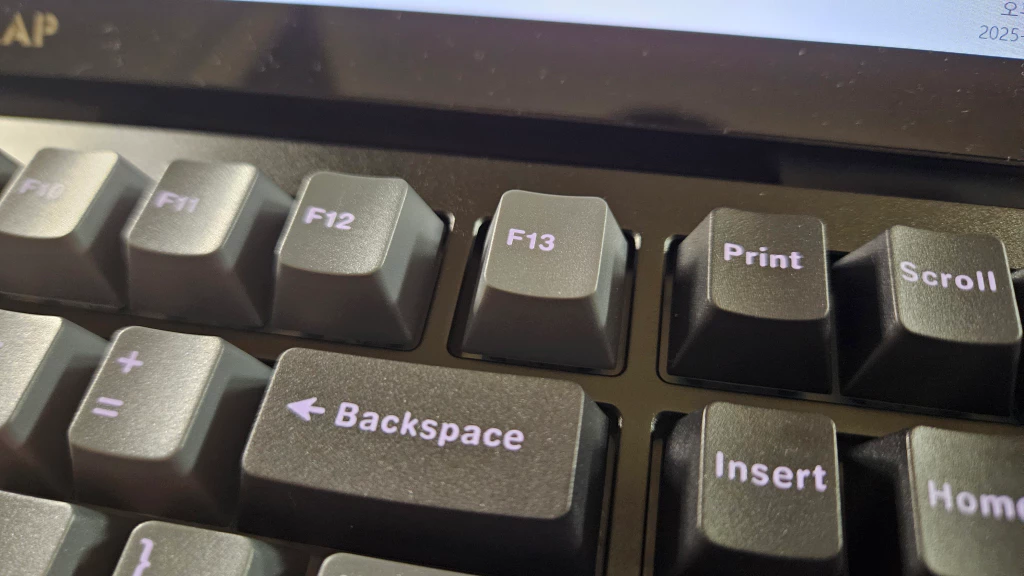 이 키보드는 폼떡 키보드라고 불릴 만큼 흡음재를 풍부하게 적용하여 타건 소음을 최소화했습니다. 덕분에 사무실이나 조용한 환경에서도 부담 없이 사용할 수 있습니다.